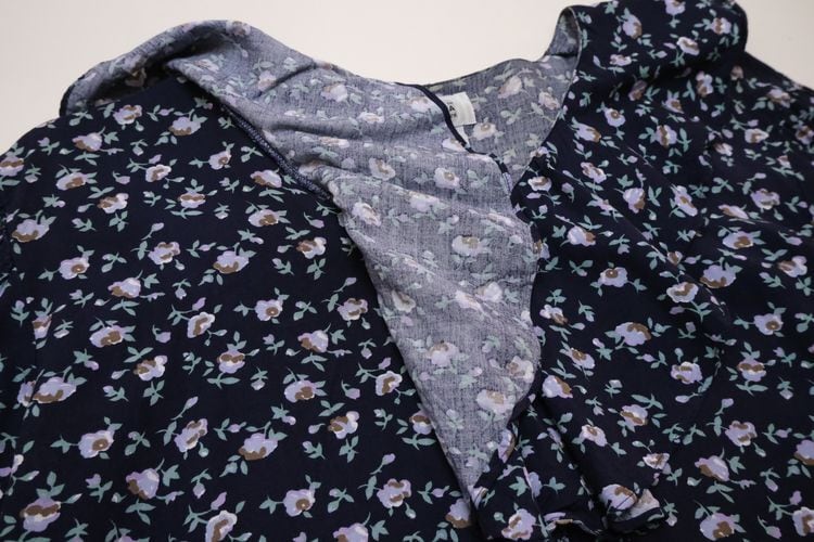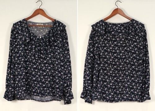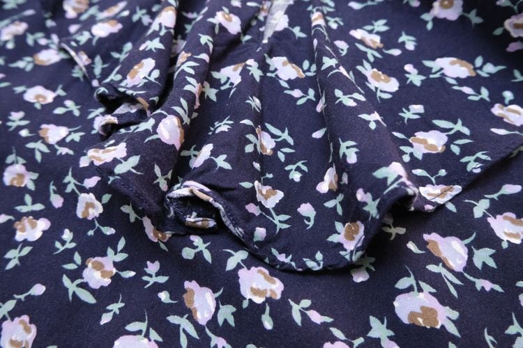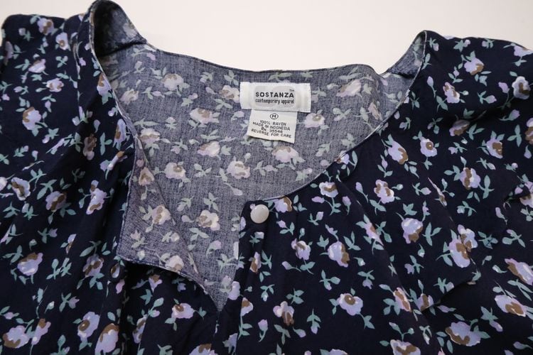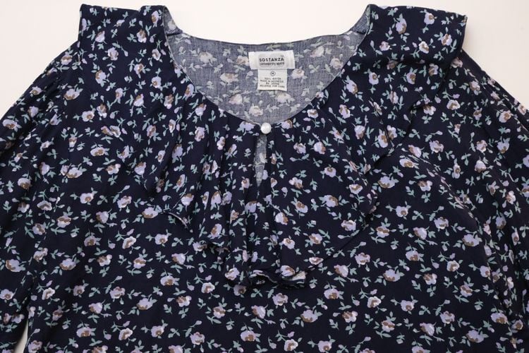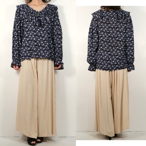 90年代小花柄レーヨンのラフルカラーブラウス。ボリュームのあるフリルのラペルがロマンティックな表情の一品です。深い開きのネックラインに肩まで伸びるラペル、オフショルダーのボリューム袖が特徴的なゆったりフィットのプルオーバースタイル。落ち感のあるレーヨン生地がシルエットのボリューム感を程よく抑え、素肌に着用しても気持ちの良い肌触りも魅力です。コンディションは良く、とくに目立ったダメージは見られません。落ち着いたカラーリングのため甘くなり過ぎず、幅広いコーディネートに馴染みます。