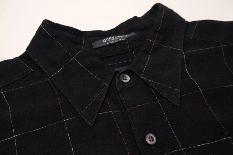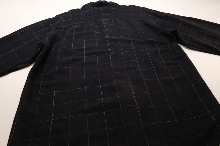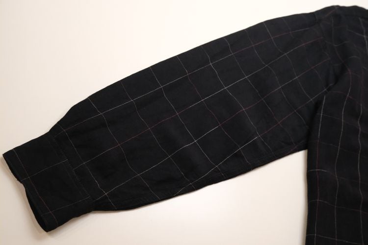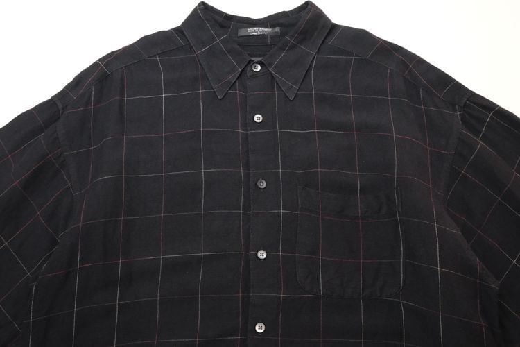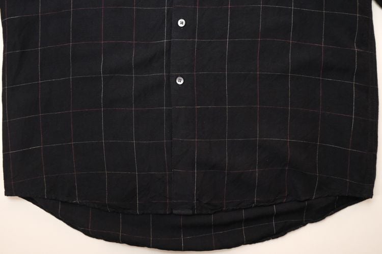 1963年にニューヨークで自身の名を冠し創設されたデザイナーズ・ブランド"GEOFFREY BEENE"から90年代頃と思われるシャツ。リネンによる自然なシワ感とレーヨンの艶が混じり合う独特な表情の混紡素材(57/43)を使用し、深みのあるブラックをベースに細いレッドとホワイトが混じり合うウィンドウペン・チェックがカジュアルながらスマートな雰囲気のアイテムです。ざっくりとした着用に適したオフショルダーのボリュームあるシルエット、小ぶりな襟、しっかりと柄合わせのされた前合わせと胸ポケットも魅力となっています。着用の上で問題となるダメージや汚れはございませんが、左袖まわりに薄っすらとした汚れの点在するUSEDコンディションですのでご理解の上ご検討ください。素材の表情、色味、織りによる風合いがたいへん良く、幅広いボトムスにさらっと合わせるだけで渋い佇まいを演出できるおすすめの1本です。