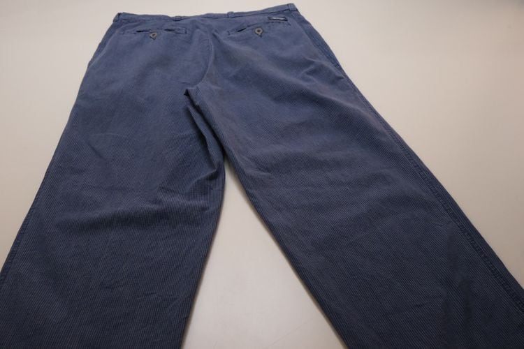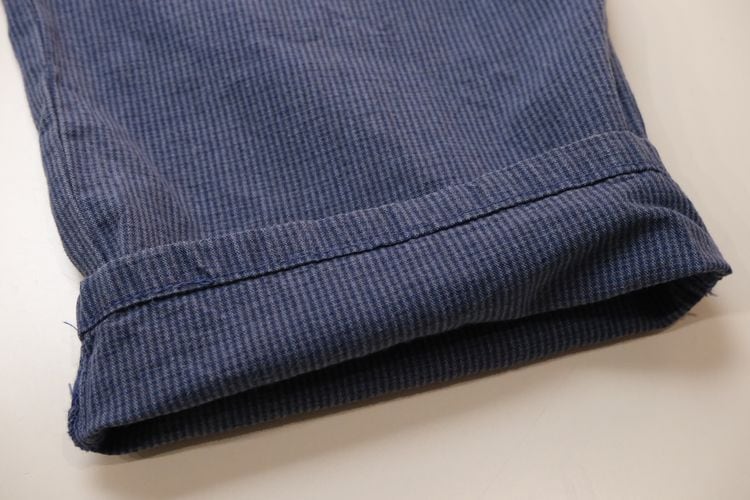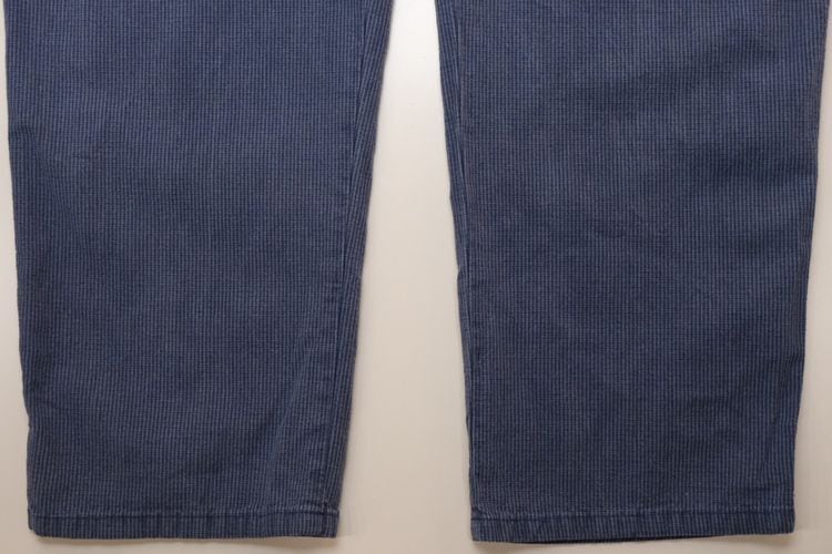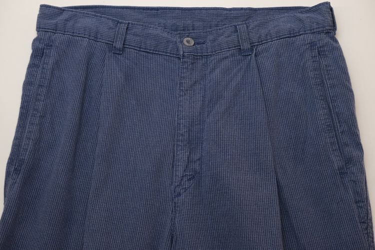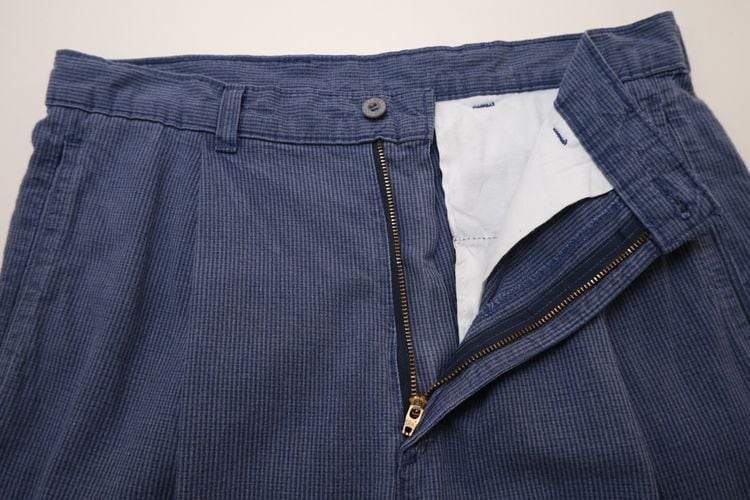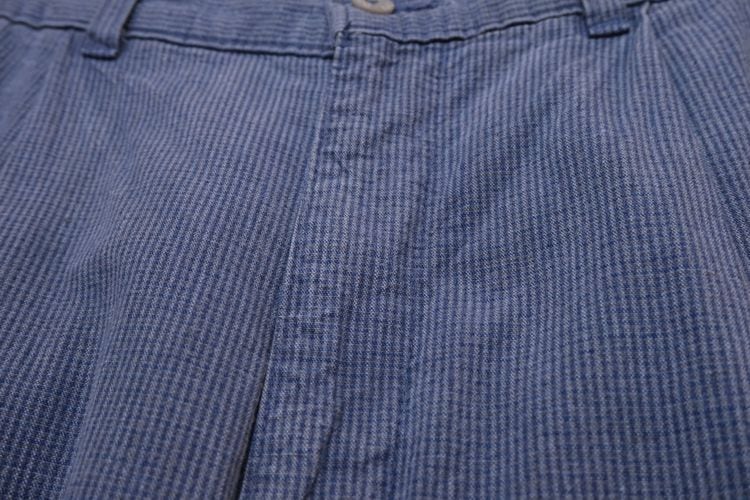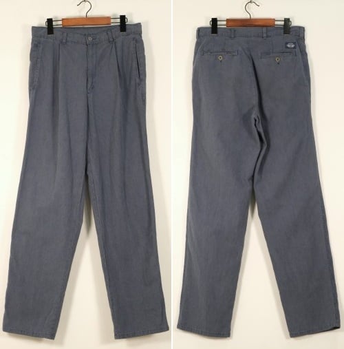 "Levi's"ブランドのひとつとして1986年に誕生した"DOCKERS by Levi's"から90年代頃のアメリカ製パンツ。コットン糸のわずかな太さの強弱によるランダムな節や凹凸が浮かぶ独特の表情に、濃淡の異なる細いブルーのヒッコリー・ストライプが経年変化で程よくフェードし、その凹凸と相まってこなれた風合いを生んでいるアイテムです。腰まわりにゆとりのある股上の深いワンタック、やや広いワタリから裾口に掛けてテーパードを効かせたルーズなシルエットが特徴となっています。着用の上で問題となるダメージや汚れはございませんが、全体的に着用による色褪せのあるUSEDコンディションですのでこの風合いの良さを好まれる方におすすめ致します。ややオーバーサイズのトップと合わせたゆるい雰囲気から、少し細みのトップと合わせたバランスあるコーディネートまで幅広く使えるおすすめの1本です。
