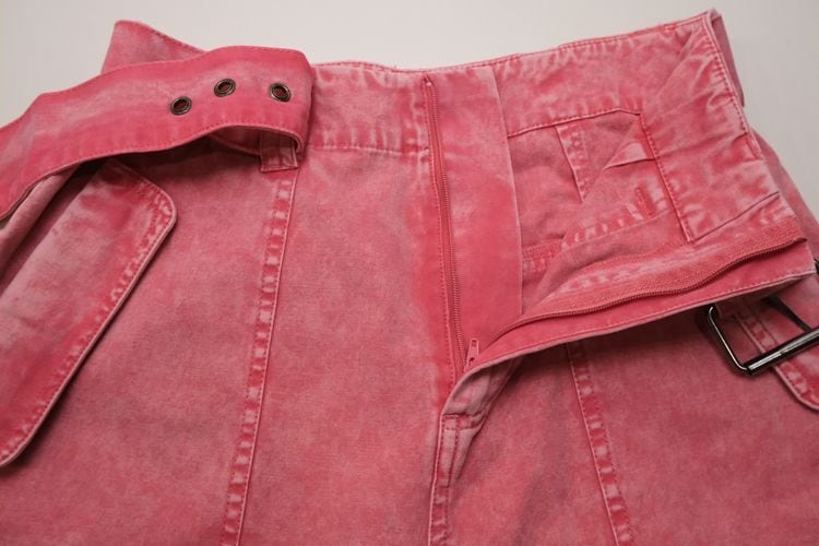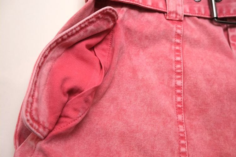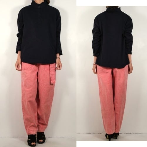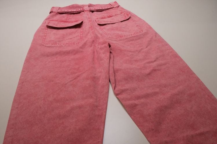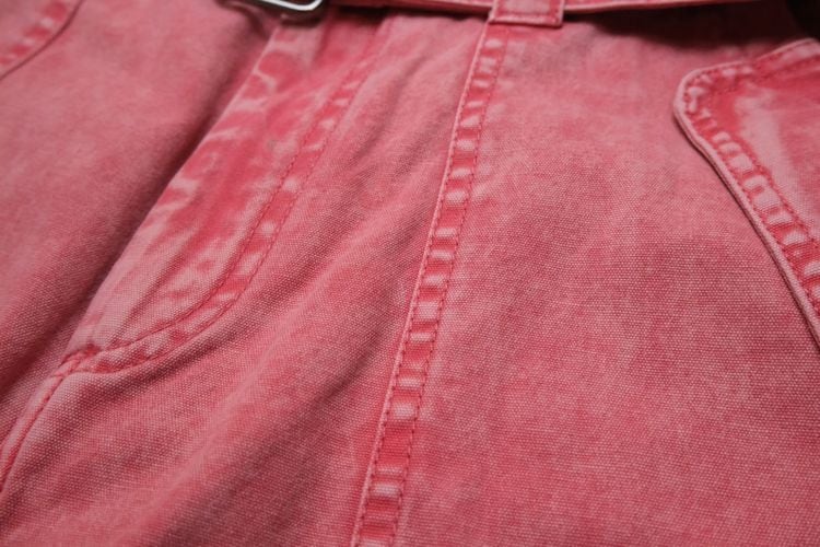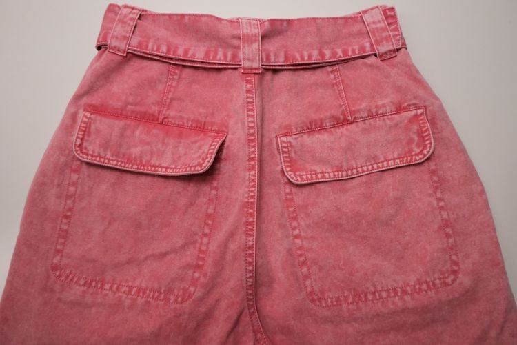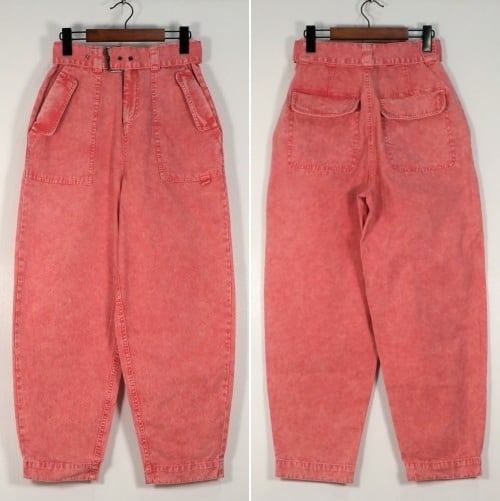 ロンドンを拠点に展開するセレクトショップ"asos"より、 コーラルピンクのバレルパンツ。ウォッシュ加工されたピンクの色みがぱっと目を惹く一品です。股上が深いハイウエストフィットに、ふっくらカーブを描くバレルシルエット、フラップ付きのベイカーポケットがポイントになったデザイン。同生地のベルトが付属しています。デニムより薄手のコットンキャンバス生地は軽い着心地でコンディションとして多少の着用感があり、フライ部分にスポットシミなど見られますのでUSED品とご確認の上ご検討ください。いつものトップスに合わせるだけでこなれた感を演出し、付属のベルトは他のボトムスにもお使いいただけ、幅広いスタイリングに活躍してくれそうです。