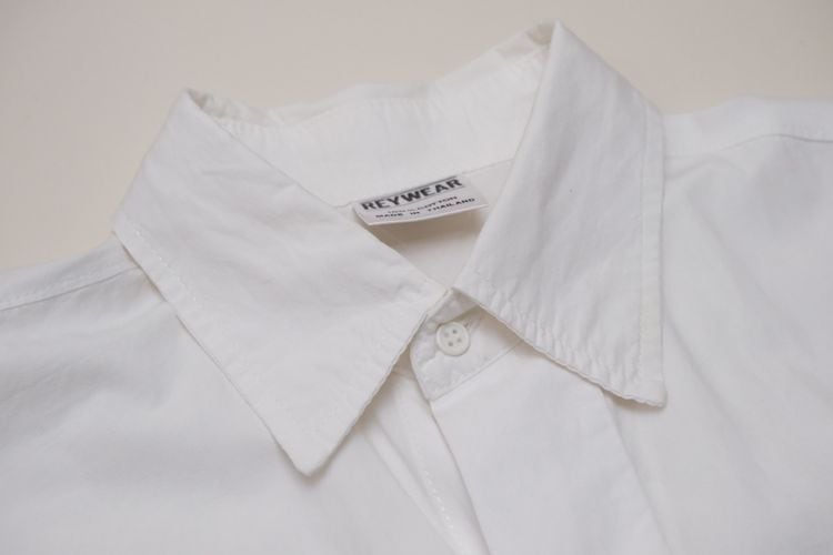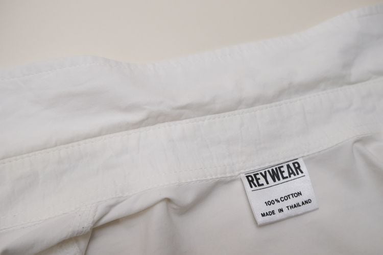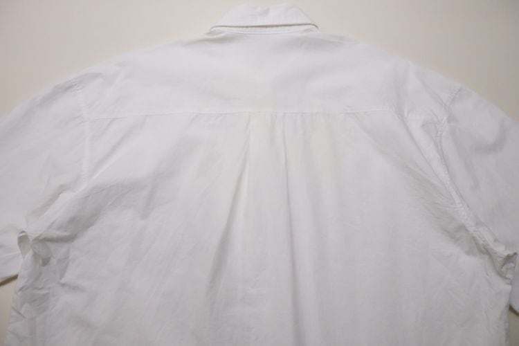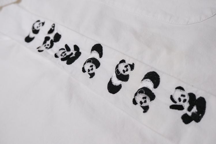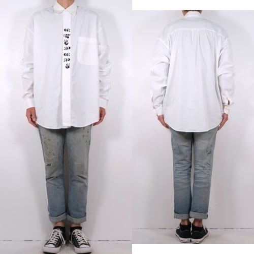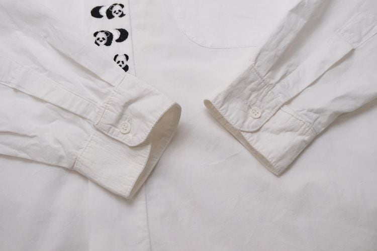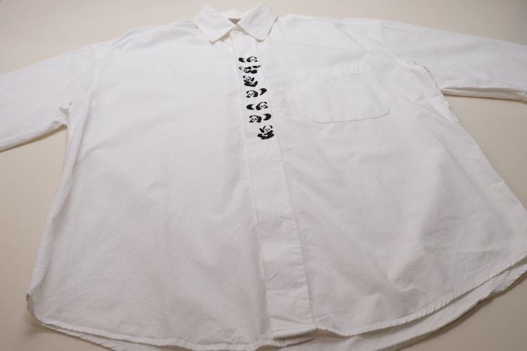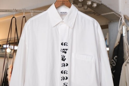 ローカル・ブランド"REYWEAR"から90年代頃と思われるシャツ。薄手ながらぱりっと張りのある100%コットン・ポプリンを使用し、ほんのりと光沢を放つホワイトの爽やかで上品な色味に比翼に沿って並ぶかわいらしい7頭のパンダ刺繍が遊び心溢れるアイテムです。ざっくりとした着用に適したオフショルダーのオーバーサイズ・シルエット、程よい大きさの襟、胸ポケットのシンプルなディテールで仕上げられています。着用の上で問題となるダメージや汚れはございませんが、後部のヨークまわりに薄っすらとした汚れのあるUSED品ですのでご理解の上ご検討ください。シンプルなボトムスにさらっと合わせるだけで個性的な雰囲気を演出でき、ジャケットと合わせたレイヤードのアクセントとしても楽しんでいただける1本です。