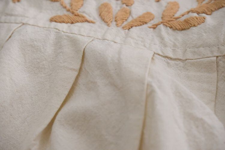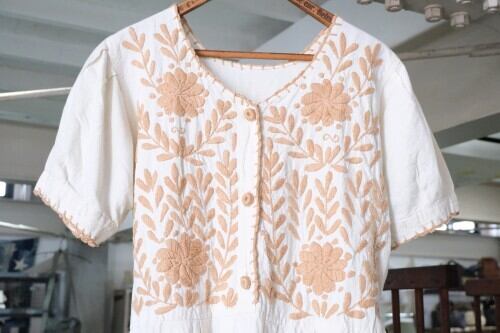 70年代刺繍入りのメキシカンドレス。前身頃にボリュームたっぷりに施された、花の刺繍が素敵な一品です。自然な風合いの生成りコットン生地をそのまま生かして仕立てられ、柔らかなベージュカラーの刺繍もボディに馴染んでいます。サイドにリボン付きでフィットを調整していただけます。コンディションとして多少の着用感があり、左腰あたりにぼんやりとしたシミ、刺繍糸に毛羽立ち、右後ろ肩に糸混じりなど見られますのでご確認の上ご検討ください。広めの襟ぐりやふっくらボタンなどのディテールも可愛らしく、一枚でもベストやデニムパンツなどとのレイヤードスタイルも楽しめそうですね。