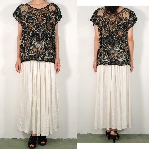 80年代カットワーク刺繍のレーヨントップ。バリの刺繍として知られる、レーヨン素材をベースに様々なモチーフとメッシュを組み合わせたカットアウトデザインのアイテムで、こちらは全面に花と葉っぱのモチーフ、肩や縁に光沢のある生地をパッチワークにした華やかなデザインが目を引きます。フレンチスリーブのプルオーバータイプで、トーンを抑えたカラーリングが品の良い印象に仕上がっています。コンディションとして多少の着用感があり、所々に刺繍糸の緩みやほつれが見られますのでUSED品とご理解の上ご検討ください。透かしデザインとレーヨンの落ち感がセクシーな質感で、さらりと着るだけで個性ある表情を演出してくれます。