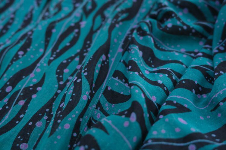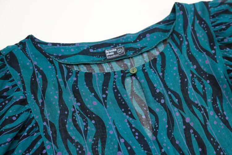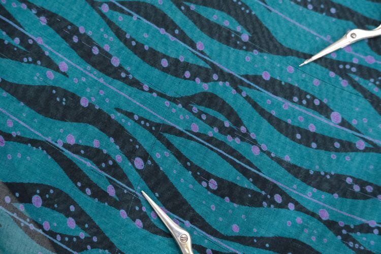 70-80年代プリント柄コットンシフォンのドレス。泡がおどる波模様のようなアニマル柄のような、ゆらめくテキスタイルが雰囲気の良いデイドレスです。深いアームホールのドルマンスリーブが特徴的なデザイン、フィットを調整できるウエストリボンが付属し、透け感のある生地が軽やかな着心地でスカートには裏地が張られています。コンディションとして多少の着用感があり、スカート裾複数箇所に糸の引きつれが見られますのでUSED品とご確認の上ご検討ください。 古いものならではのデザインと素材感をご堪能いただけ、日常着として親しみやすい一品です。