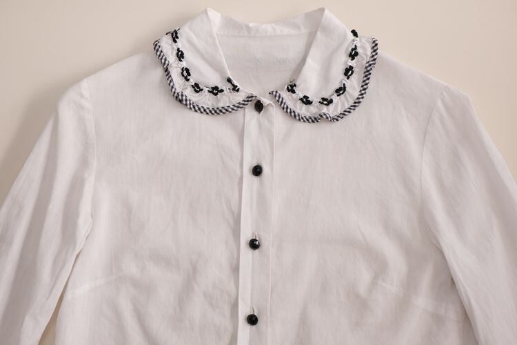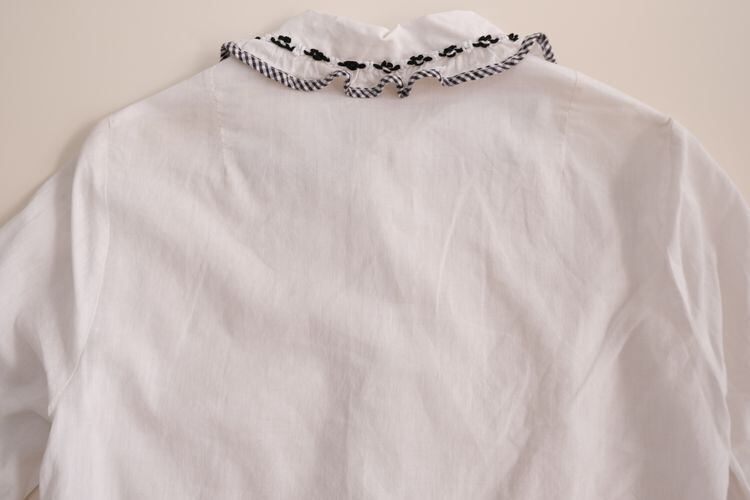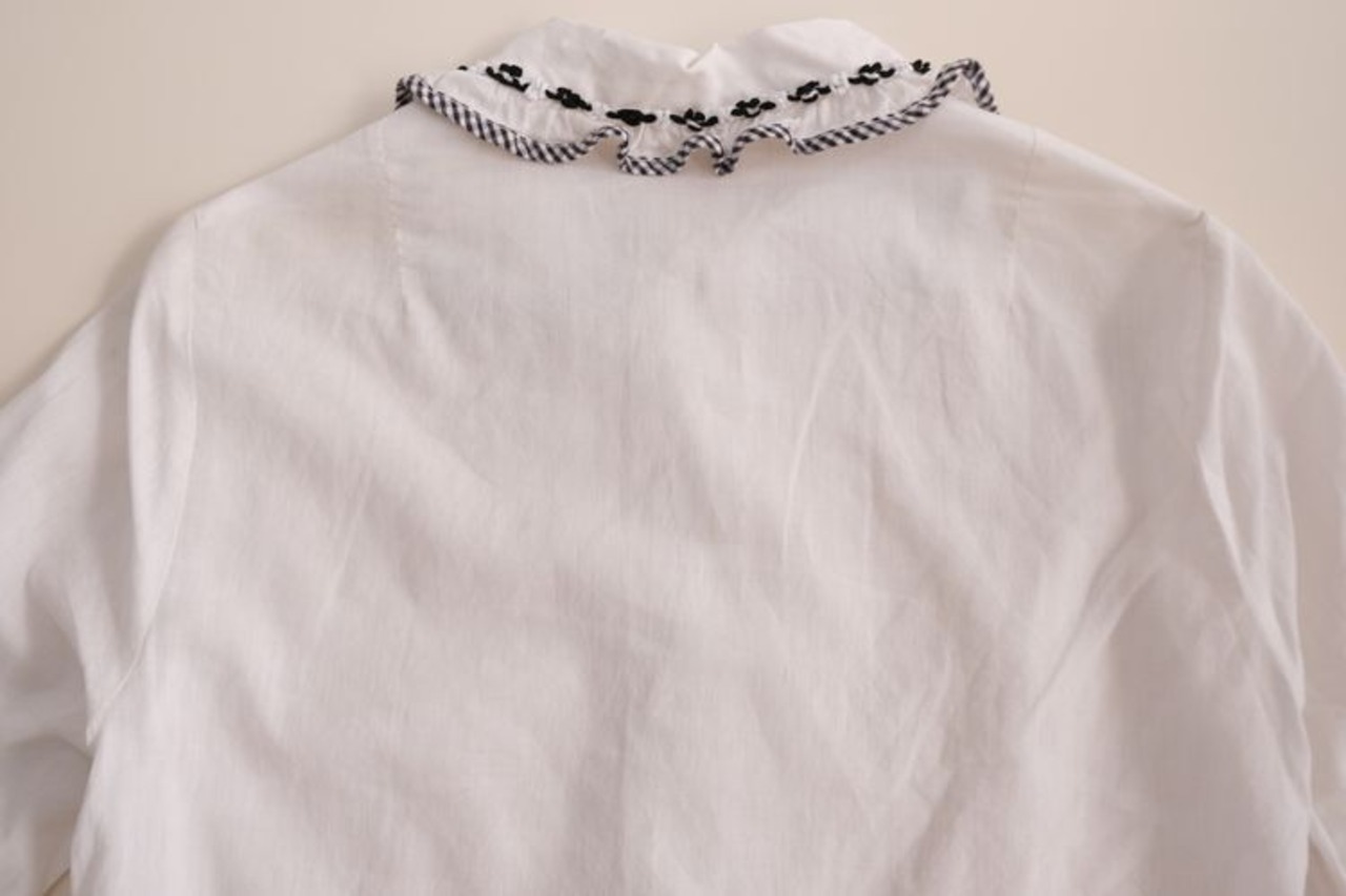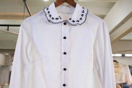 50年代リボンテープ飾りのラウンドカラーブラウス。仕立てからボタンホールまで全て手仕事により作られた、一点ものと思われるヴィンテージピースです。襟と袖口に花模様のテープ飾りとギンガムチェックの縁取りがあしらわれ、ジュエリーのようなカッティングのグラスボタンもアクセントになり、モノトーンのデザインながら華やかな印象です。繊細な質感の綿ローン生地は古いものならではの風合いに優れ、ぴりりと清潔感がある素材感です。コンディションとして左肩や首後ろ内側などに変色、下から2番めのボタンまわりに生地のリペアが見られますのでUSED品とご確認の上ご検討ください。また年代が古く、コットン生地が繊細なため、古いものの扱いに慣れている方にお勧めいたします。ジャケットやカーディガンインナーとしても存在感があり、ヴィンテージならではのデザインをお楽しみいただける逸品です。