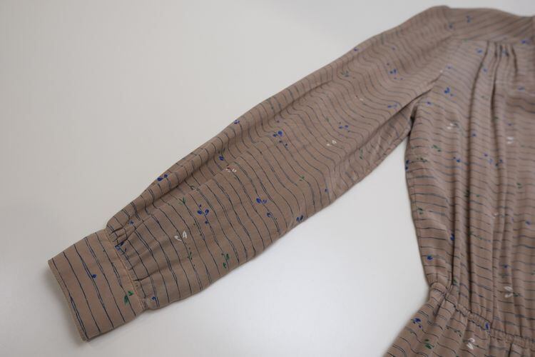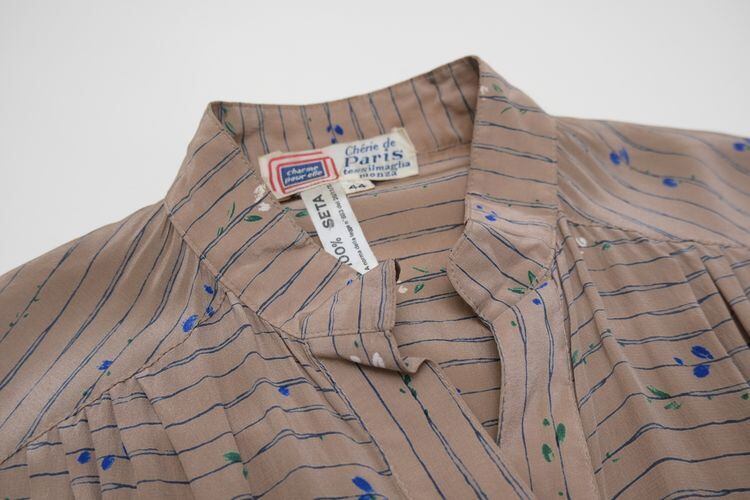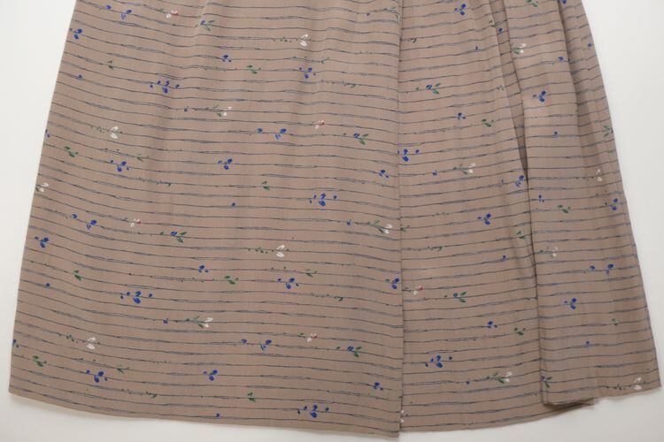 80年代スタンドカラーのブラウスドレス。100%シルクの上品な素材感に、ストライプのように見えてさりげなく植物のモチーフになったテキスタイルが目を引くデイドレスです。ヨーク下にギャザーが寄せられたっぷりとしたシルエットのトップに、フロントのみプリーツが施されたラップアラウンドスタイルのスカート。ウエストはゴム入りでプルオーバーでの着用となります。とくに目立ったダメージはございませんが、多少の着用感が見られますのであくまでUSED品とご確認の上ご検討ください。シルク素材はロングシーズン着用いただけ、一枚でもジャケットやカーディガンなど羽織っても素敵です。