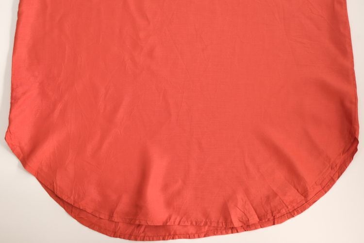 90年代オープンカラーのシルクロングシャツ。テラコッタ色がかった深い赤の華やかな色みがコーディネートのポイントになるシルクシャツです。さらさらと軽い質感が特徴の100%ピュアシルクの質感がシンプルなボディに引き立ち、おしりまですっぽりと隠れるロング丈でその贅沢な素材感をご堪能いただけます。着用感はあまり感じられませんが、左肘付近にぼんやりと薄いシミがございますのでUSED品とご確認の上ご検討ください。シルク素材は季節を問わず、肌触り良くリラックスした着心地でお楽しみいただけます。