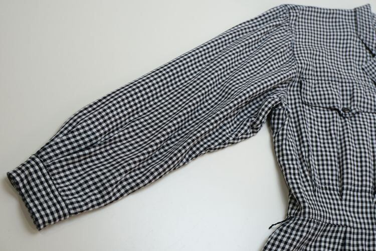 80年代 Liz Claiborne ギンガムチェックのシャツドレス。落ち感のあるレーヨン×ウール混素材が上品なシルエットを描く、大人顔のデイドレスです。大きなフラップポケットや背中のヨークがアクセントになったオープンカラースタイルで、スカートは広がりを抑えたペンシル型のミドル丈、シャビーなスナップボタンのディテールが特徴です。コンディションとして多少の着用感があり、全体に生地のくたびれ感、ボタンの塗装剥がれなど見られますのでUSED品とご確認の上ご検討ください。また今後生地の弱りが進みスナップボタンが外れる可能性がありますのでスカートのボタンはできるだけ開けずに着用することをおすすめ致します。秋や春は一枚で、冬はタイツなど合わせカーディガンなど羽織ってスリーシーズンお楽しみいただけます。