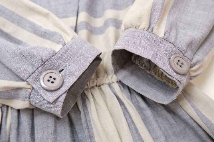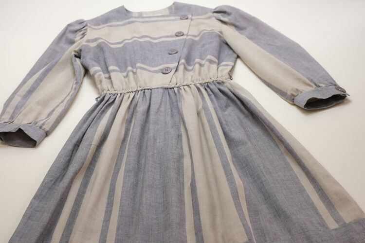 70年代ストライプ柄アシンメトリーボタンアップのデイドレス。大きなボタンが斜めに並んだヨークパネルのデザインが素敵なドレスです。肩がふっくらとした七分丈のバフスリーブに膝下丈スカートが特徴のクラシックなデザインを、縦横を大胆に切り替えた大判ストライプのテキスタイルがモダンな印象に仕上げています。おそらくコントン×ポリエステル混紡と思われる生地はほんのり透け感があり軽い着心地で、綺麗なシルエットを保つ程よい張り感があります。コンディションは良く、とくに目立ったダメージは見られません。ウエストはゴム仕様で、お手持ちのベルトを合わせるだけでスタイルが完成します。