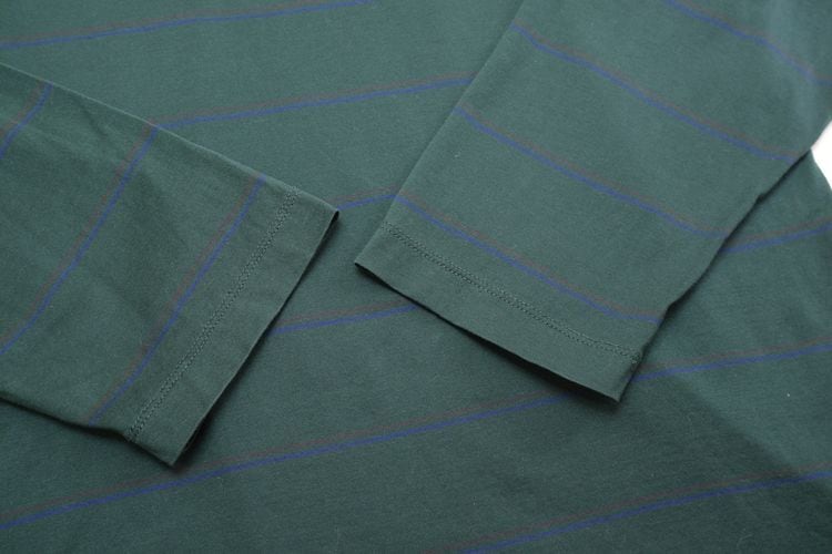 1972年の登場以来、アメリカン・スタイルのアイコンとして高い人気を誇る Ralph Lauren のポロ・シャツ。ソフトで滑らかな肌触りが特徴の100%ピマ・コットンを贅沢に使用し、深いフォレストグリーンの色味をベースに溶け込むように入るブルー×レッドの細いボーダー、左胸に施されたポニー刺繍がアクセントとなっているアイテムです。着用の上で問題となるダメージや汚れはございませんが、後部の中央に小さなダメージ補修のあるUSEDコンディションですのでご理解の上ご検討ください。定番のボックス・シルエットはスキニーからワイド・パンツまで幅広く合わせることができ、くったりと身体のラインに馴染むリラックスした着用を楽しんでいただけ、袖口リブのないものは少し珍しいため気になる方は是非ご検討ください。
