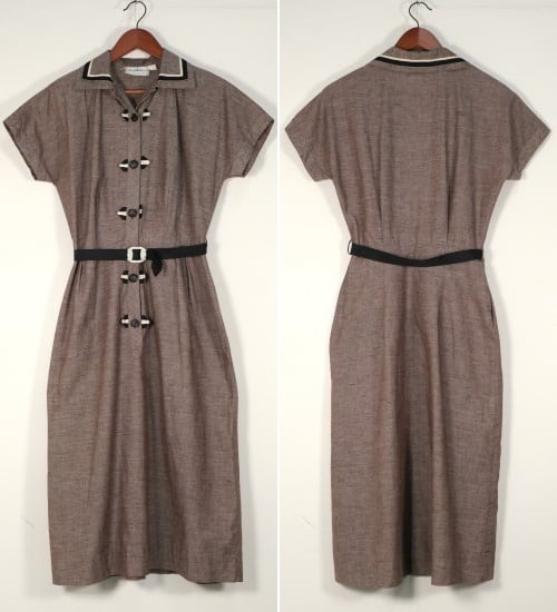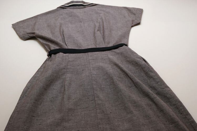 40年代リボントリムのベルト付きロングドレス。ボタンまわりやラペルにあしらわれたモノトーンカラーのグログランリボン飾りがアクセントになった、クラシックな佇まいが目を引くヴィンテージドレスです。オープンカラーにフレンチスリーブが特徴のトップに広がりを抑えたロングスカート、ブリキ製バックルのグログランベルトが付属します。ネップ入りのコットン生地は程よい張りのある質感で、ボディラインにフィットするシルエットを美しく描きます。殆ど着用感は見られず、ヴィンテージアイテムとしてはたいへん綺麗なコンディションです。控えめなカラーリングながら華やかさのあるデザインはカーディガンやジャケットなどを羽織っても素敵で、デイリーにもパーティーシーンにもお勧めの一品です。