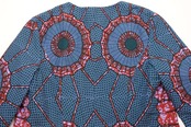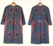 アフリカン・ファブリックのノーカラーコート。クモの巣の様な大胆なテキスタイルがインパクトたっぷりのアイテムです。60年代スタイルのフィットしたシルエットに、ノーカラーや九分袖、飾りポケットのディテール、巨大なボタンがひとつ配されたオープン型のスタイル。綺麗なグリーンカラーのコットン裏地が全面に張られ、細部まで柄合わせされた仕立ての美しさも目を引きます。コンディションは良く、とくに目立ったダメージは見られません。シンプルな服に羽織るだけでひとと違ったお洒落をお楽しみいただけます。