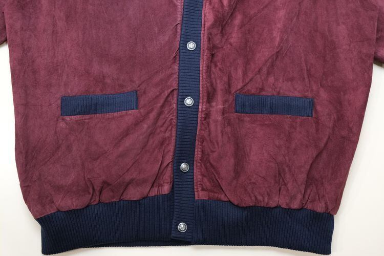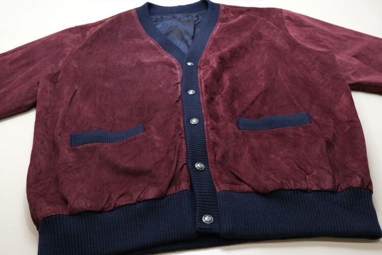 80年代頃と思われる unknown レザー・ジャケット。やわらかで肌触りなめらかなスエード(表記なし)を使用し、ワインレッドの色味とスエードらしい毛羽立った素材の表情に大人な雰囲気を感じるアイテムです。この年代らしいオフショルダーのざっくりとしたシルエット、小ぶりなVネックのボタン・アップ、首まわり、前開き、ポケット、袖口に使用されたネイビーのリブがアクセントとなっています。着用の上で問題となるダメージ汚れはございませんが、経年保管による細かなシワがありますので普段から古いものをご愛用の方におすすめ致します。レザー・ジャケットとしては軽量な着心地と、カジュアルながら深い色味とスエードによる落ち着いた雰囲気がたいへん良く、ありそうでないかなり珍しい1点ですので気になる方は是非ご検討ください。