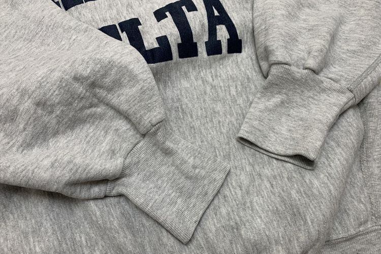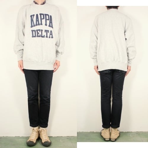 90年代初期頃と思われる MVP COR Inc. ベースのアメリカ製スウェット。厚手でしっかりとしたコットン×アクリル(90/10)混紡素材を使用し、両脇のリブ編み、ゆとりのあるアームのシルエットが特徴的なチャンピオンのリバースウィーブと同じ仕様のアイテムです。この年代らしい霜降りライトグレーの色味と、着用と経年による少しやれた素材感に新品とは違うこなれた雰囲気があり、中央に大きく入る "KAPPA"DELTA" のネイビー2段プリントが個性的な仕上がりとなっています。着用の上で問題となるダメージや汚れはございませんが、全体的に着用による毛羽立ち、歪みのあるUSEDコンディションですのでご理解の上ご検討ください。ざっくりとリラックスした着用に適した大きめのシルエットとシンプルなカラーは幅広いボトムスと合わせて楽しんでいただけ、オーバーサイズの着用として女性にもおすすめできる1本です。
