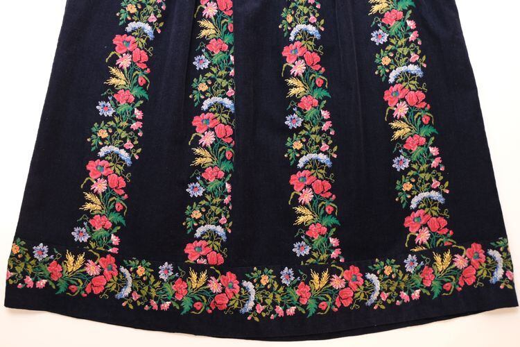 80-90年代花柄のコーデュロイロングスカート。縞模様にプリントされた色鮮やかな花々がロング丈に贅沢に映え、品の良さと個性が際立つアイテムです。細い畝のコーデュロイはベルベットのような深みのある質感を生み、コーデュロイの凹凸感により花柄がまるで刺繍のようにも古いデジタル画のようにも見え、不思議な雰囲気を醸し出しています。生地が厚すぎないため軽くふわりと広がるシルエットを描き、軽い着心地も魅力です。コンディションは良く、とくに目立ったダメージは見られません。裾にもぐるりと花柄があしらわれているため、ロング丈のトップスに合わせても素敵です。