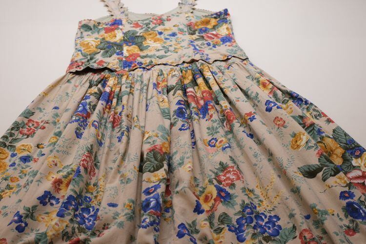 80年代ボタニカル柄のキャミソールドレス。ストラップやトップのジグザグカットのヘムが特徴的なデイドレスです。一見キャミとスカート2ピースに見える段差を作ったデザイン、薄手の生地感に淡いトーンの花柄が良く馴染んでいます。ヴィスコース×コットン混紡の生地はさらりとした滑らかさとふわりと軽い柔らかさが特徴で、トップに裏地がつきます。コンディションは良く、とくに目立ったダメージは見られません。一枚でキャミドレスとしても、Tシャツやブラウスに重ねたジャンパードレスとしても着用いただけ、カーディガンやデニムジャケットなど羽織った着こなしも素敵です。