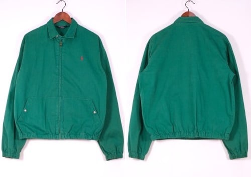 80年代初期頃の Ralph Lauren アメリカ製のジップアップ・ジャケット。厚手でしっかりとした100%コットン・ツイルを使用し、着用と経年によって変化した色味やアタリなどの風合いに1点ものらしい魅力を感じるアイテムです。チンストラップの付くやや小さめの襟、スラッシュ・ポケット、この年代らしいジップアップのざっくりとした太いシルエット、レッドで施されたラルフ・ローレンのワンポイント刺繍がアクセントとなっています。着用の上で問題となるダメージや汚れはございませんが、色あせやアタリのあるUSEDコンディションですので、この1点ものらしい雰囲気の良さを好まれる方におすすめ致します。さらっとリラックスして羽織るのにたいへん重宝し、鮮やかなグリーンの色味ですが着用と経年による表情からこなれた雰囲気で落ち着いた着用をしていただけます。