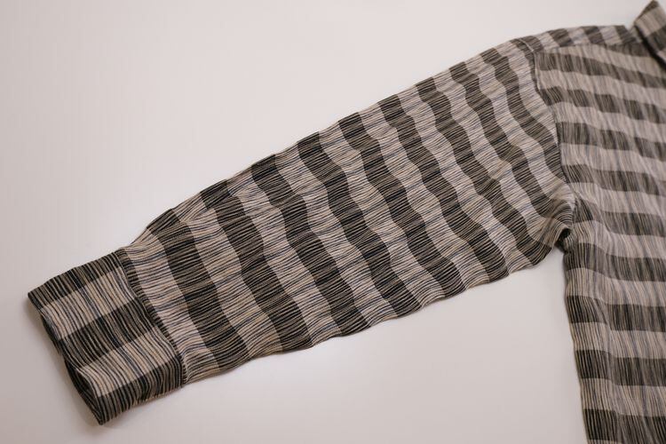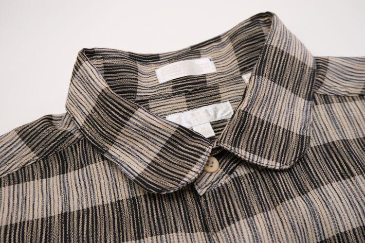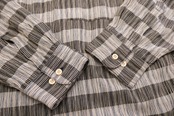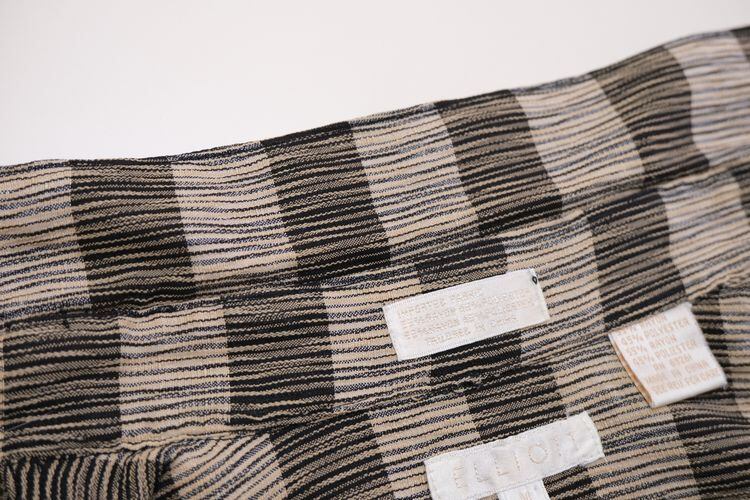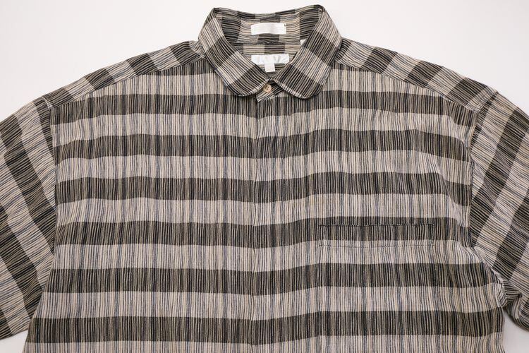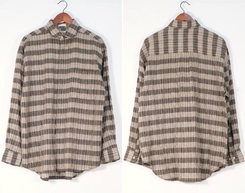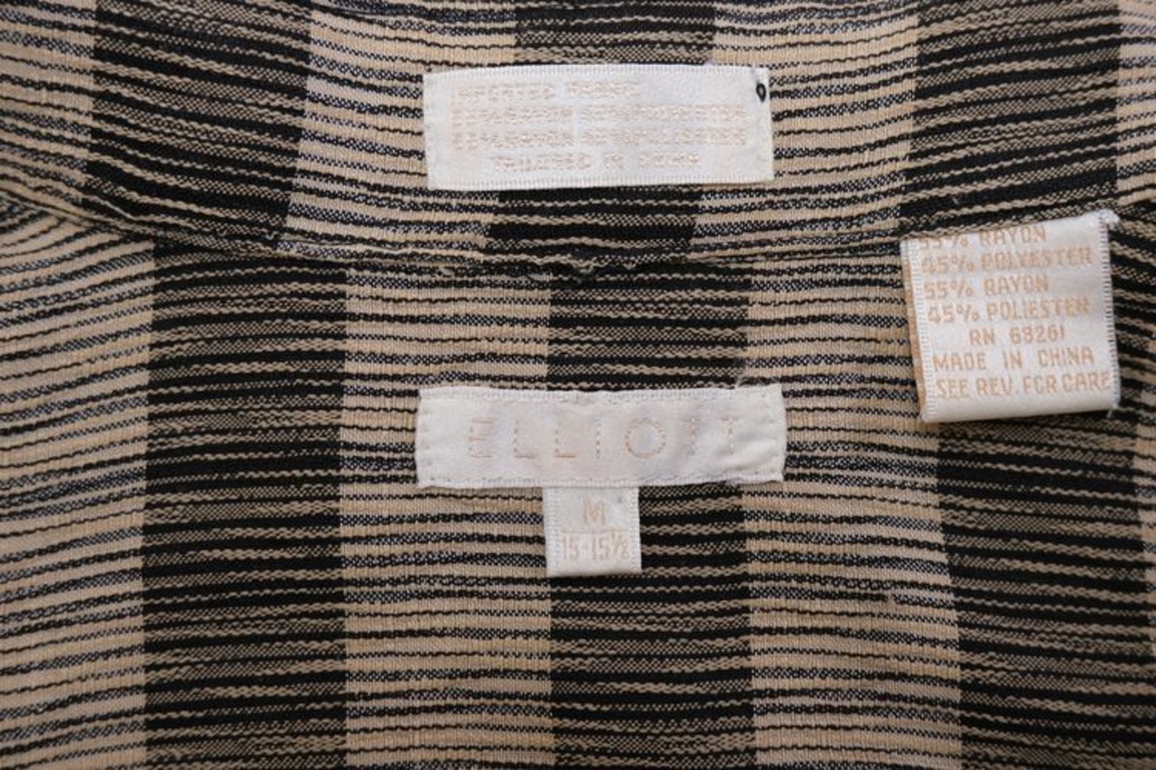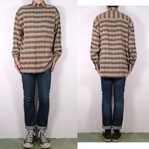 90年代頃と思われる ELLIOTT から長袖シャツ。程よい厚さでやや張りのあるレーヨン×ポリエステル(55/45)混紡素材を使用し、凹凸のある細いストライプに太いボーダーを組み合わせた織り模様がたいへん渋い雰囲気の良いアイテムです。リラックスした着用に適したボリュームあるシルエット、ラウンド・カラー、柄合わせのされた胸ポケット、ボタンホールとボタンを見せない比翼仕立てによるスマートな仕上りも魅力となっています。着用の上で問題となるダメージや汚れはございませんが、全体的に着用感のあるUSEDコンディションですのでご理解の上ご検討ください。ややオーバーサイズぎみのざっくりとしたサイジングはリラックスした着用に適し、シンプルなボトムスにさらっと合わせるだけで大人っぽい印象を演出できるシャツです。