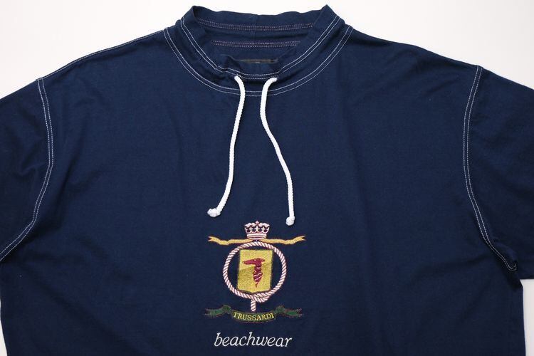 1910年設立イタリアを代表するファッションブランド TRUSSARDI より、ハイネックTシャツ。中央にあしらわれたブランドエンブレムの刺繍が目を引く一品です。紐が通されたハイネックに、白いステッチがアクセントになったデザイン。深いアームや正方形に近いボックス型シルエットには野暮ったさの残る味わいがあります。全体的に着用感があり、腹部にぼんやりとした色落ち、背中右寄りの中央に生地のリペアがございますのでUSED品とご確認の上ご検討ください。洗練されていない雰囲気に憎めない魅力があり、デイリーに楽しみたいアイテムです。