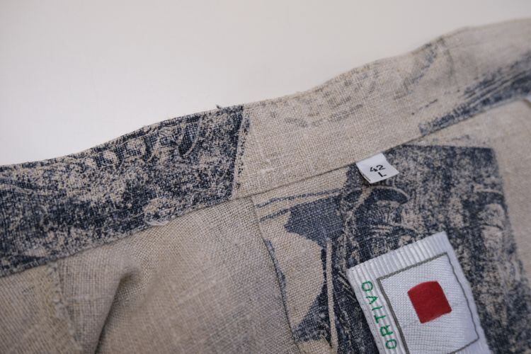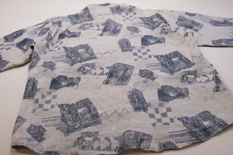 80年代頃と思われる benetti SPORTIVO のプリント・シャツ。リネンに比べ繊維が太く腰のある素材感が特徴の100%ヘンプ(※表記はリネン)を使用し、ブラウングレーのアッシュがかったナチュラルな色味に風合いの良さを感じるアイテムです。ざっくりとした着用に適したボリュームあるシルエット、首元をすっきりと見せるノーカラー、大きな左胸ポケット、そして抽象的な模様と写真の青焼きのようなプリントが全面に施されたテキスタイルが個性的な仕上がりとなっています。着用の上で問題となるダメージや汚れはございませんが、ヘンプ独特のシワがあるUSEDコンディションですのでご理解の上ご購入ください。通気性と速乾性に優れたヘンプ素材のため暑い季節も着心地良く、まだまだ硬い素材感のためこれから着込んでいくと自分の身体に馴染む変化を楽しんでいただけます。