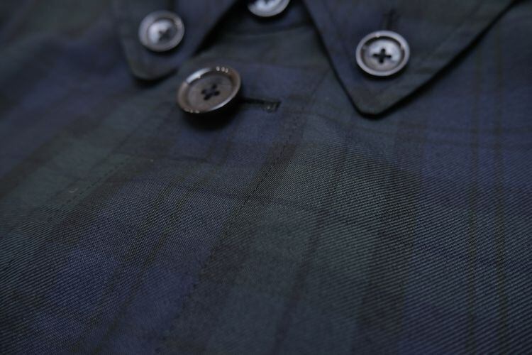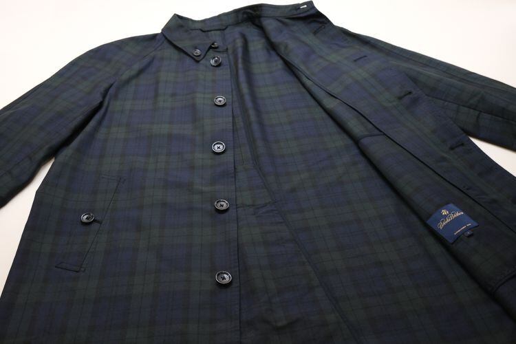 1818年ニューヨークに誕生したアメリカで最も歴史のある衣料品店"Brooks Brothers"『ブルックス・ブラザーズ』から2000年代頃と思われるステンカラー・コート。やや薄手でぱりっと張りのある100%ポリエステルを使用し、ブラック×ネイビー×グリーンで構成されたブラック・ウォッチ・タータンがたいへん渋い雰囲気のアイテムです。上品な比翼仕立て、肩のラインをすっきりと見せるラグラン・スリーブ、セーターなどの厚手の上から着用できるアームホールと袖の太いシルエット、袖口のスリーブ・ストラップ、そしてボタンダウンのカラーが珍しい仕上がりとなっています。着用の上で問題となるダメージや汚れのない良いコンディションですが、着用感のあるUSED品ですのでご理解の上ご検討ください。セットアップと合わせたオーバーコートとしての着用から、カジュアルなコーディネートを引き締める大人っぽい着こなしまで幅広く楽しんでいただける1本です。