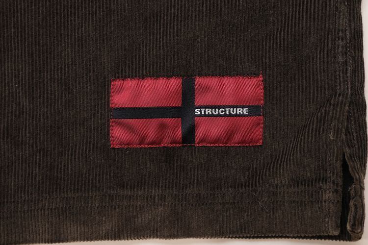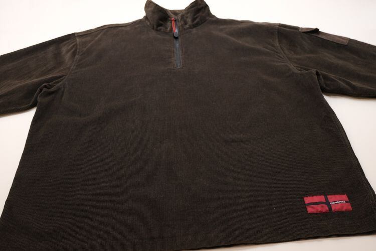 2000年代頃と思われる"STRUCTURE"プルオーバー・ジャケット。やわらかな肌触りと凹凸ある表情が魅力の細畝コーデュロイ(100%コットン)を使用し、単色ダークブラウンで仕上げられたシンプルさに魅力のあるアイテムです。スタンド・アップのカラー、ジップアップ・プルオーバー、オフショルダーのボリュームあるざっくりとしたシルエット、左袖に付くポケット、左裾口に入るブランドパッチがアクセントとなっています。着用の上で問題となるダメージや汚れはございませんが、全体的に着用感のあるUSEDコンディションですのでご理解の上ご検討ください。ざっくりとした着用に適したサイズ感と渋いダークブラウンの色味がたいへん良く、合わせるものを選ばずさらっと着用していただける使い勝手の良い1本です。