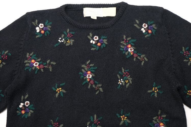 80年代花の刺繍入りクルーネックセーター。全面に花モチーフの手刺繍が施された、可憐なデザインが印象的なウールニットです。タイトめのフィット感、やや着丈が長めのボディに、ゆったりめのアームときゅっと絞られたカフスがフェミニンなシルエット、ウエストリブはハイウエストにフィットします。100%ウールのミドルゲージニットは温かな着心地で、かさ張らずコンパクトなシルエットを描きます。コンディションは良く、とくに目立ったダメージは見られません。クラシカルな花々がコーディネートのスパイスになり、ジャケットのインナーなどとしても活躍してくれそうです。