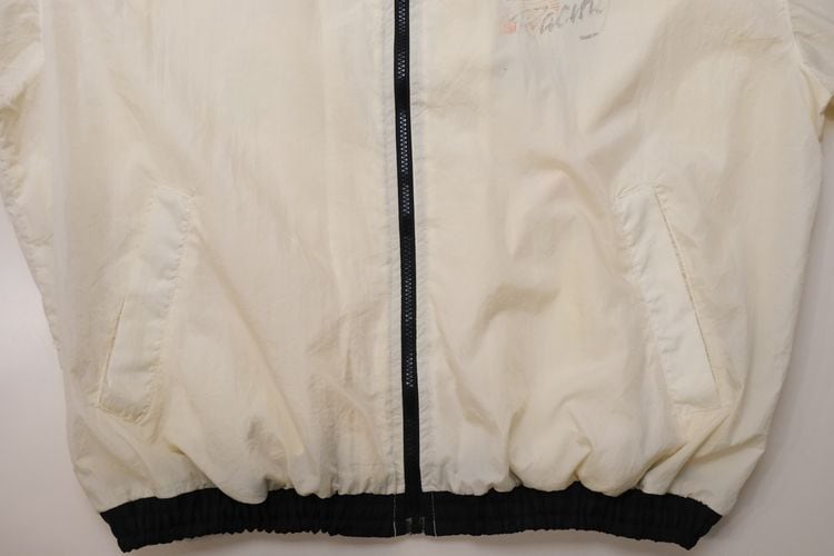 "The British Petroleum"『BP』のエンジンオイル・ブランド"Catrol"『カストロール』から90年代頃のジャケット。薄手でシャリッとした100%ナイロンを使用し、透け感のあるクリーム・カラーをベースにブラック×オレンジ×グリーンの切り替えがたいへん個性的な仕上がりのアイテムです。ざっくりとした着用に適したオーバーサイズ・シルエット、ジップ・アップ×スラッシュポケットのシンプルなデザイン、そして左袖、襟裏、左胸、背中に入る"Castrol GTX Racing"のかすれたプリントがアクセントとなっています。着用の上で問題となるダメージ汚れはございませんが、後部の首下まわりに薄っすらとした汚れ、各所のロゴ・プリント表面が剥がれ落ちていますのでこの風合いを好まれる方におすすめ致します。シンプルなボトムスにさらっと合わせるだけで十分な個性を演出でき、軽く羽織れる薄手のアウターですのでシャツなどのトップ1枚では少し肌寒い季節や夜間の気温が低いときに重宝すると思います。