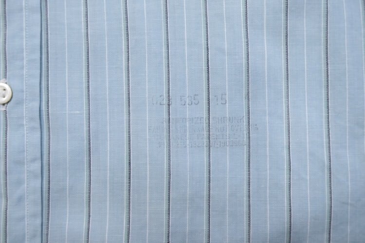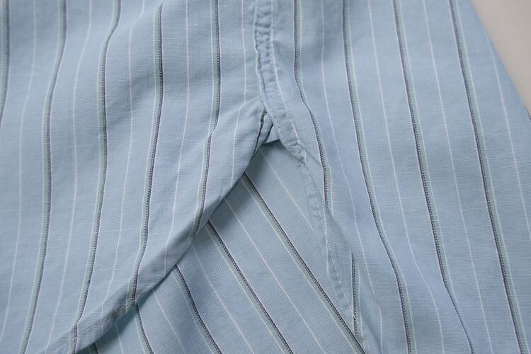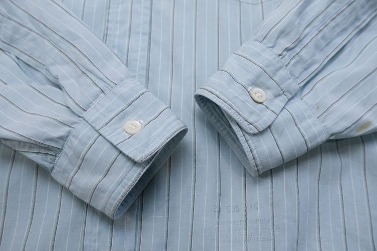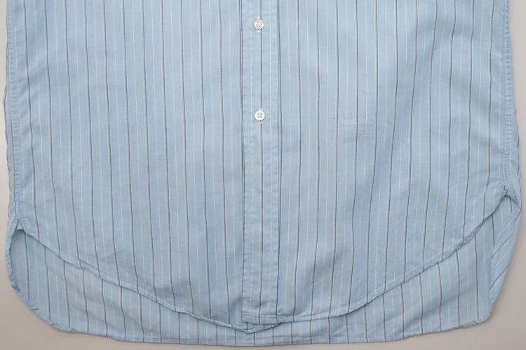 1900年代初期頃にオハイオ州シンシナティで創業された老舗シャツ・カンパニー"THE MACK SHIRT CORP"から50年代頃のドレス・シャツ。やや薄手で洗い晒したような表情に特徴のある"SANFORIZED"『防縮加工』100%コットンを使用し、ライトブルーの色味をベースに細いストライプが入るヴィンテージらしさが魅力のアイテムです。小ぶりなカラー、マチ付きの裾、柄合わせのされた胸ポケット、シェル・ボタン、クセのないすっきりとしたシルエットはスマートな印象で着用していただけます。着用の上で問題となる大きなダメージや汚れはございませんが、前たて裾口上、左袖に複数の汚れ、全体的に着用感のあるUSED品ですので普段から古いものをご愛用の方におすすめ致します。シンプルなボトムスにさらっと合わせるだけでヴィンテージ・テイストをプラスしたスタイリングを楽しめるおすすめの1本です。
