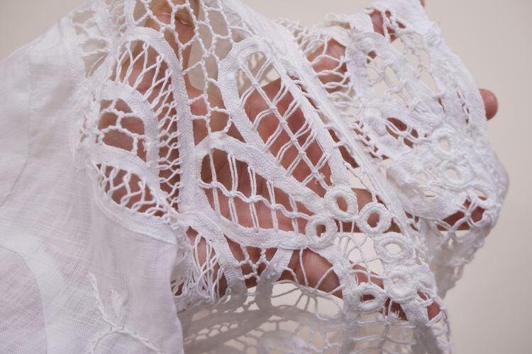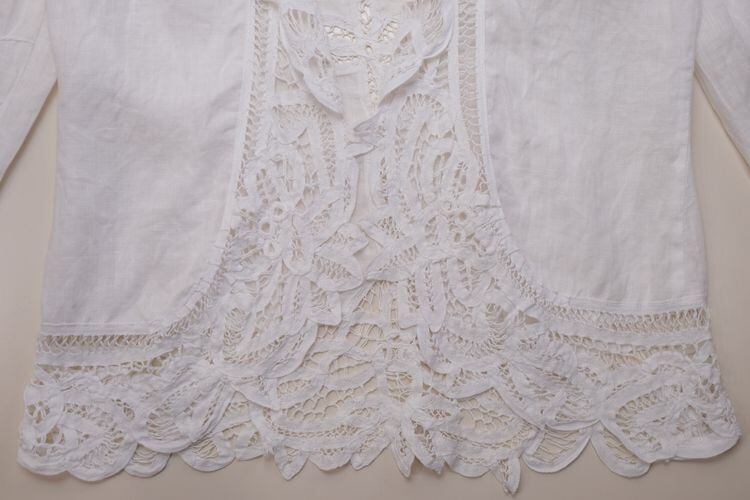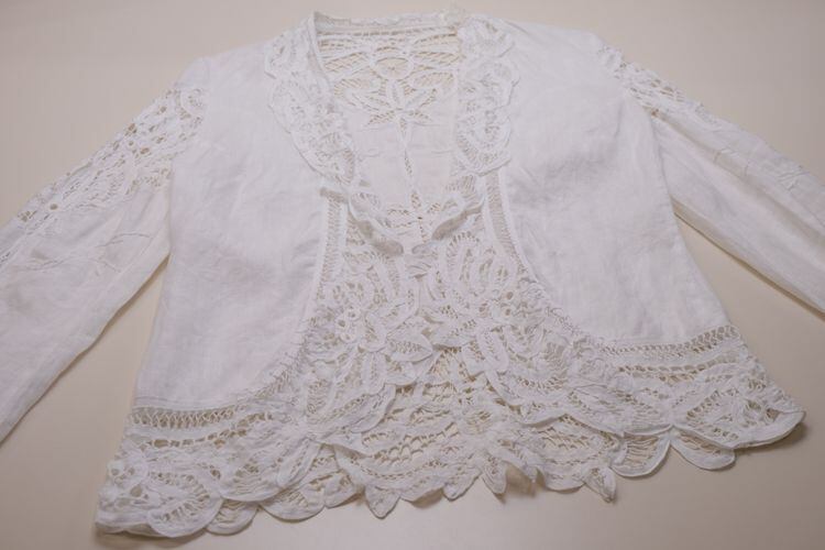 80年代ホワイト色バテンレーストリムのオープンジャケット。襟元から裾までぐるりと縁取り、背中や袖、カフスにもたっぷりとあしらわれた透かしレースが美しい一品です。レースや刺繍はすべて手仕事によるもので、圧巻の表情に仕上がっています。ウエストや背中のラインが綺麗なフィットシルエット、丸いカットのフロント裾が特徴です。おそらく100%リネンと思われる薄手生地はやや透け感があり、通気性に優れ涼しく肌触りの良い着心地の良さも魅力です。とくに目立ったダメージは見られませんが、多少の着用感が見られますのであくまでUSED品とご確認の上ご検討ください。合わせるインナーによってレースの表情がかわり、幅広いスタイリングでお楽しみいただけるアイテムです。