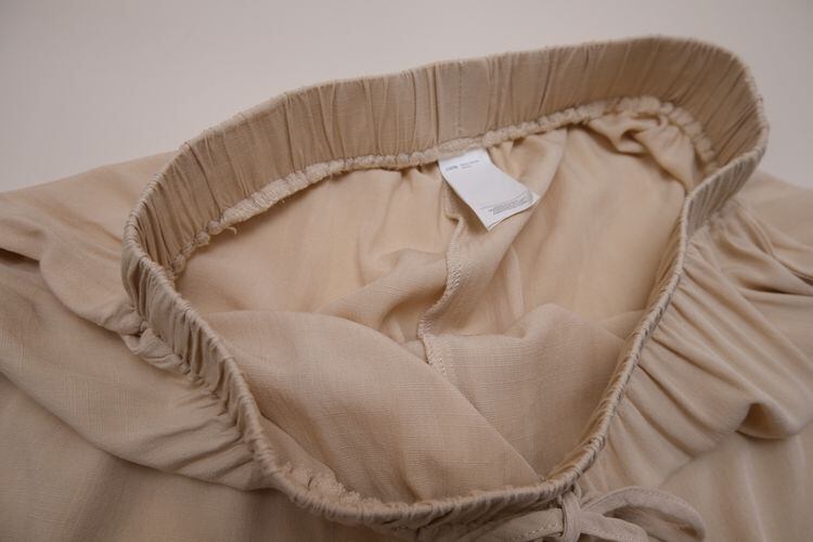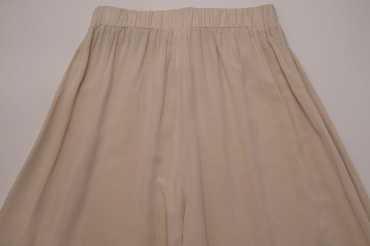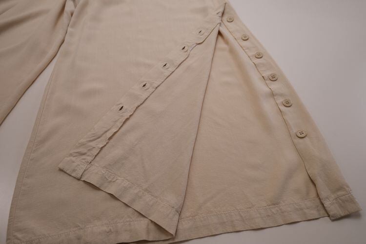 ベージュ色レーヨンのイージーワイドパンツ。両サイドのボタンアップデザインが素敵な、リラックススタイルのパンツです。深めの股上にワイド幅のウエストゴム、裾までゆったりとのびるワイドシルエット。紐は飾りのみのデザインになっています。リネンを模した凹凸感と滑らかなドレープ感が特徴のレーヨン生地が上品な印象に仕上がっています。コンディションは良く、とくに目立ったダメージは見られません。ベーシックなカラーリングのため合わせるトップスを選ばず、幅広く着回しに活躍してくれると思います。