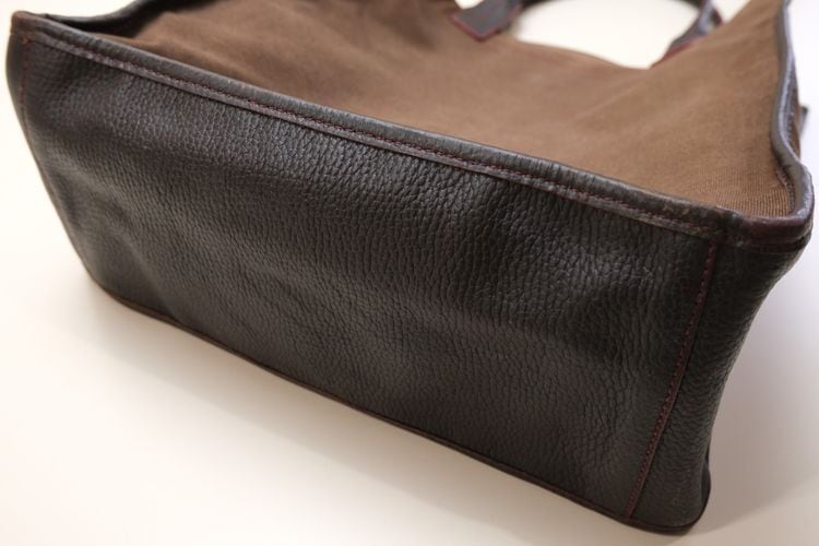 1998年"Richard Lambertson" and "John Truex"によってニューヨークで設立されたバッグ・ブランド"LAMBERTSON TRUEX"から2000年代のトート・バッグ。厚手でしっかりとしたキャンバス地を使用し、ヴィンテージのような風合いのアッシュブラウンに、ハンドルやボトムにはダークブラウンのレザーを組み合わせた渋く洗練された雰囲気のアイテムです。メイン収納は広めのマチで大容量を確保し、内部には大きなメッシュの吊りポケットとキー・フックを備え、外側の両サイドにもポケットを配した高い実用性、全体に広がるダークトーンの落ち着いた雰囲気にステッチとハンドル・コバの赤がぱっと映え洗練された印象を与えています。ご愛用の上で問題となるダメージや汚れはございませんが、全体的に使用感のあるUSED品ですのでご理解の上ご検討ください。タウンユースからビジネスまで幅広くマッチする落ち着いた雰囲気がたいへん良く、こちらのバッグは2006年にアメリカの大手メディア"Condé Nast"『コンデナスト』とのコラボレーションで製作された希少なものですので気になる方は是非ご検討ください。※発送の際は畳んでの包装となりますのでご了承ください。